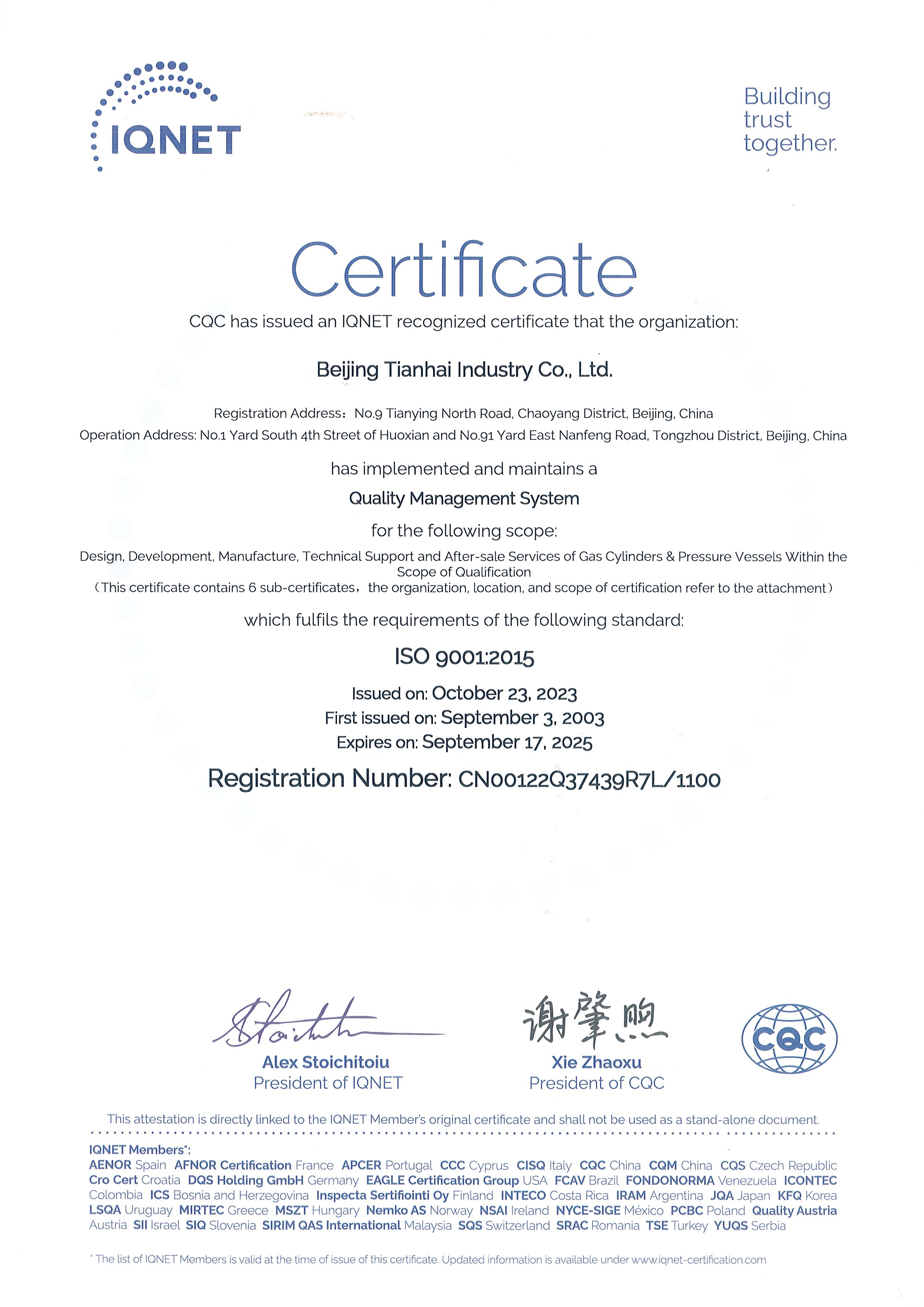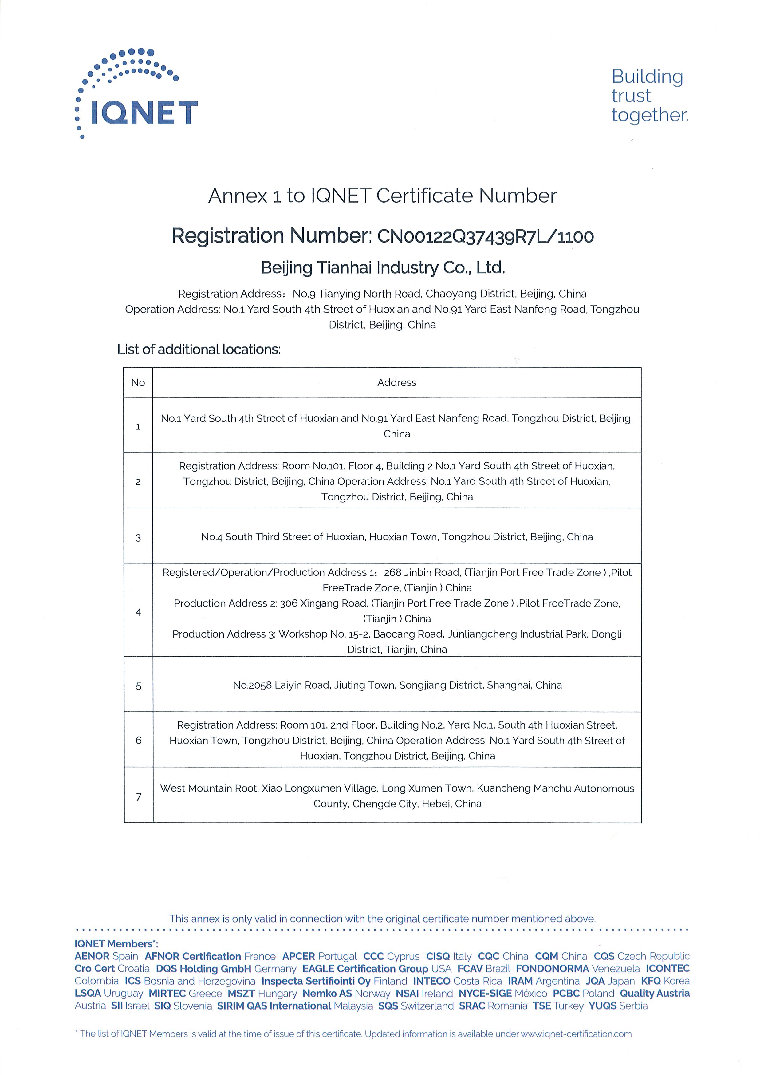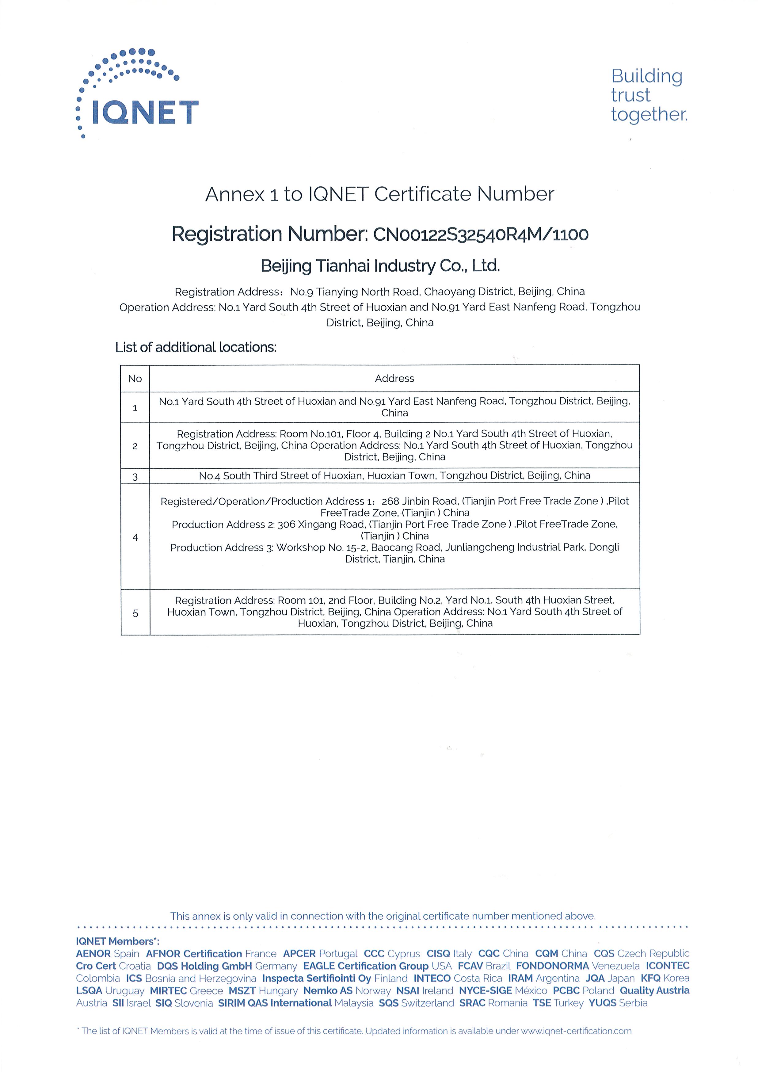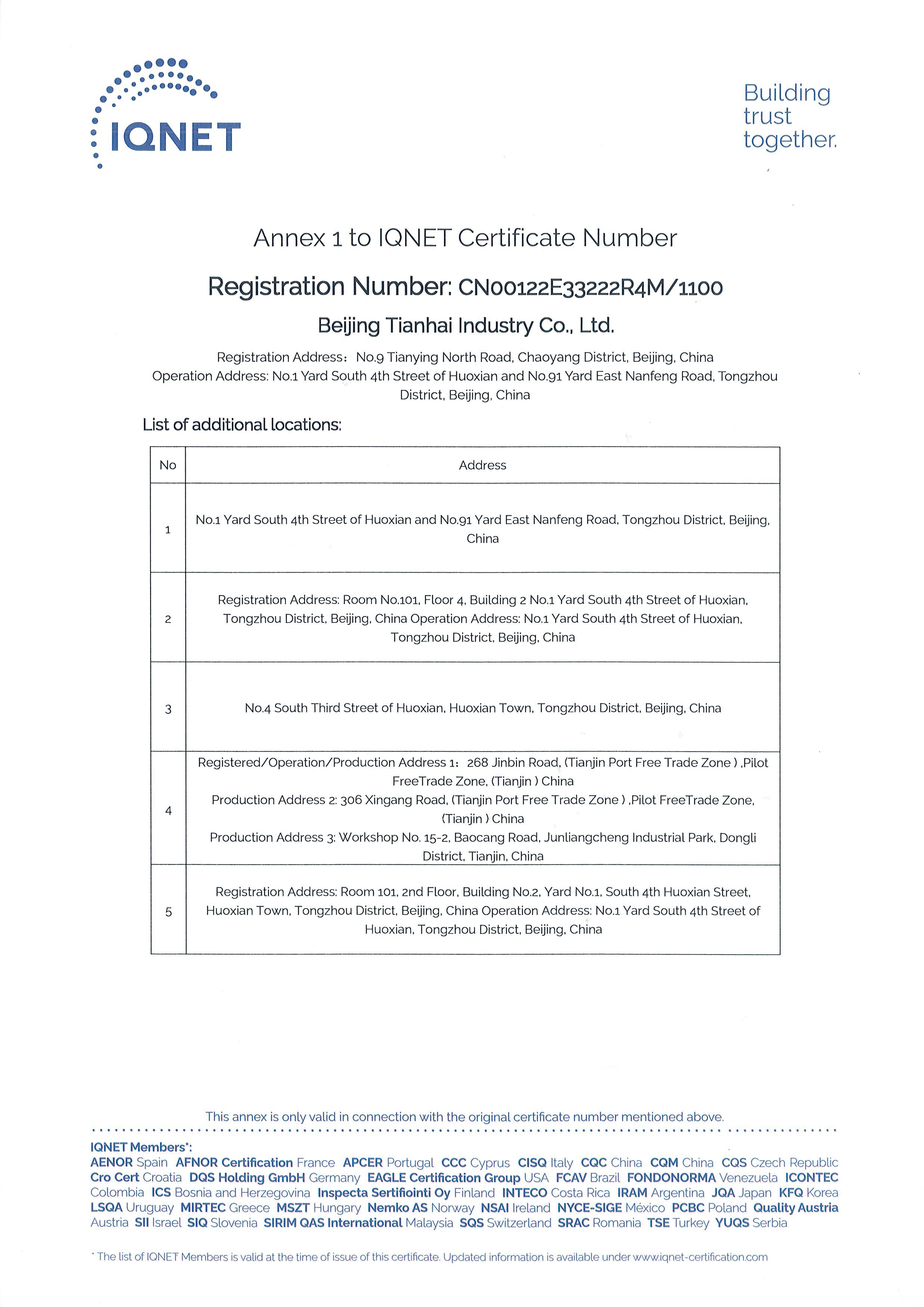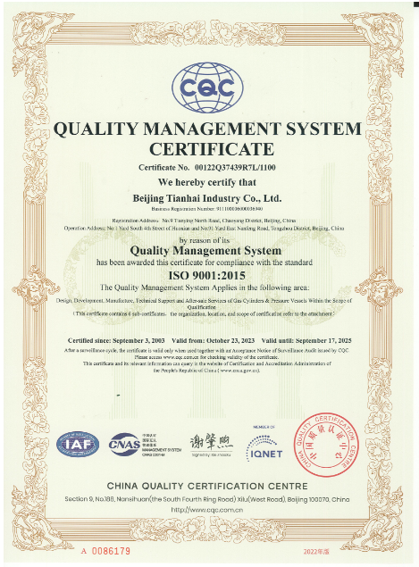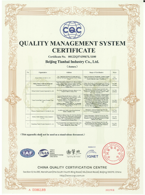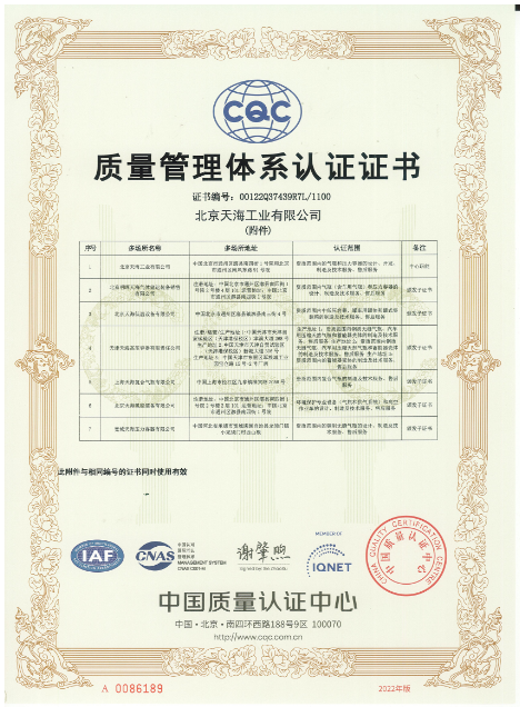 2010年9月,天海工業(yè)為保證品牌質(zhì)量,保證產(chǎn)品一致性,建立了集團(tuán)一體化ISO9001質(zhì)量管理體系,通過(guò)中國(guó)質(zhì)量認(rèn)證中心的集團(tuán)式認(rèn)證并取得證書(shū)。
