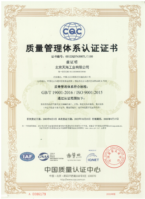 2000年4月,天海工業(yè)建立了ISO9001:1994質(zhì)量管理體系,通過(guò)中國(guó)質(zhì)量認(rèn)證中心的認(rèn)證并取得證書(shū)。