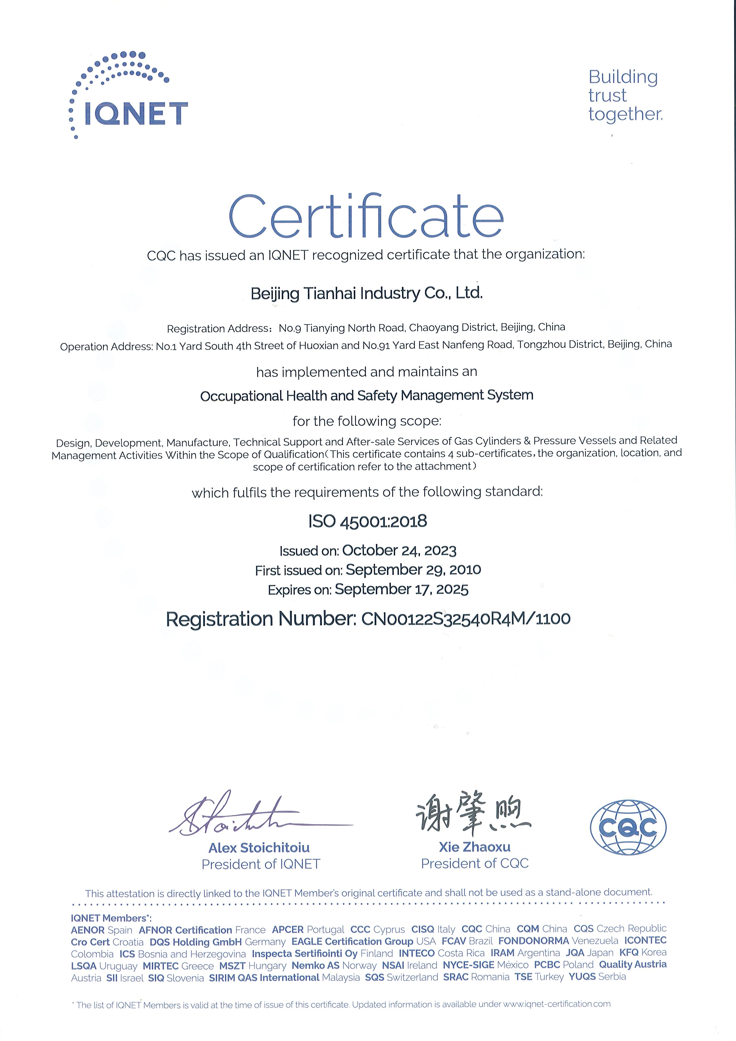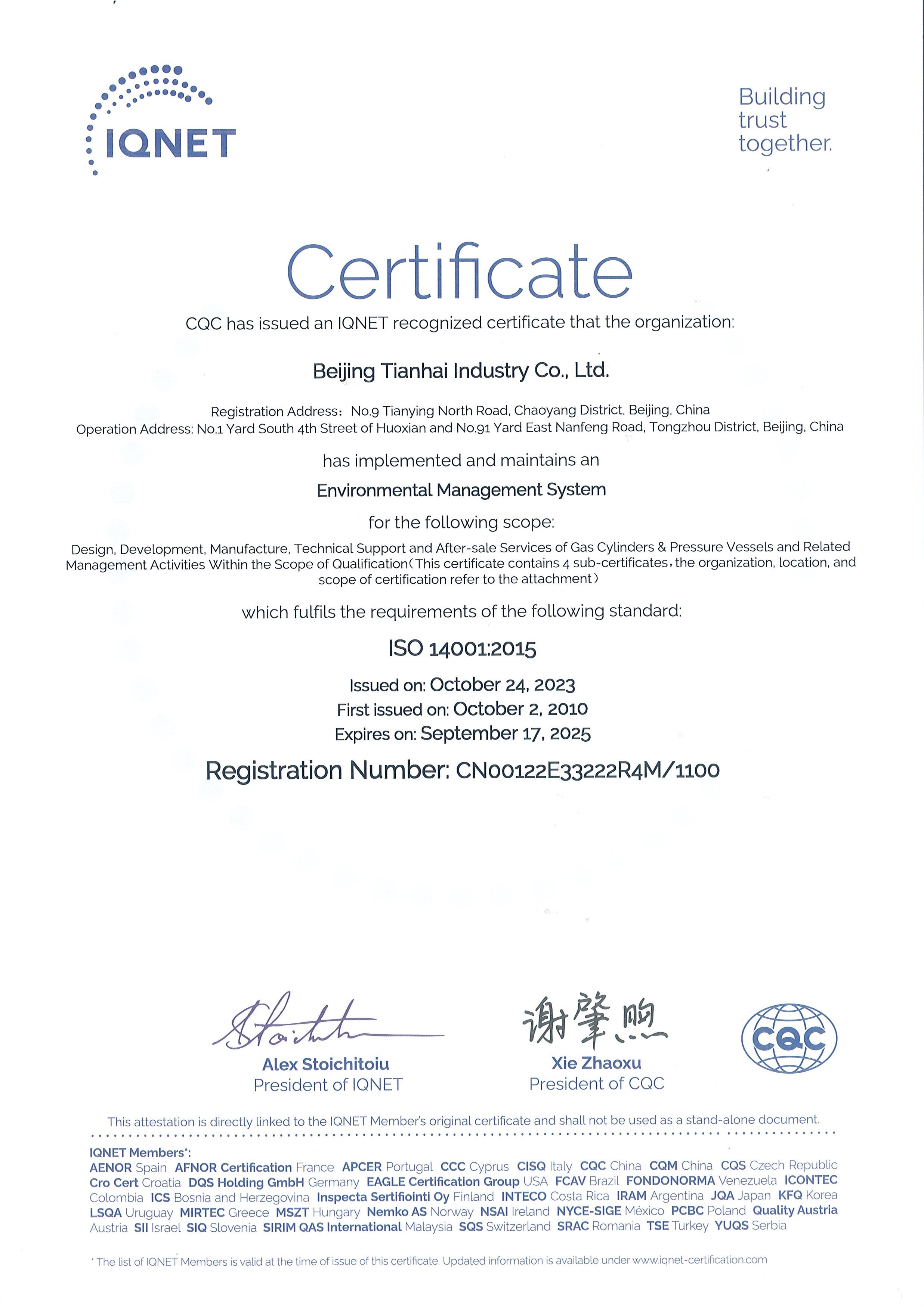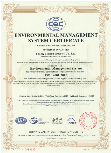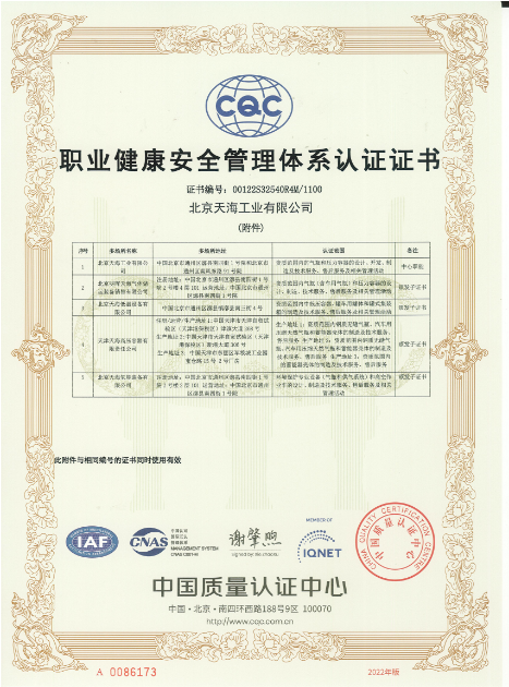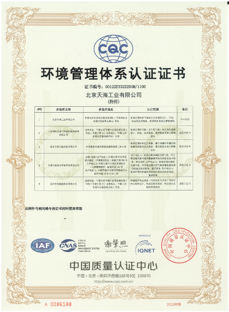 2010年-2015年,天海工業(yè)陸續(xù)建立了ISO14001和OHSAS18001環(huán)境和職業(yè)健康安全管理體系,整合了天海工業(yè)“三體系”,通過(guò)中國(guó)質(zhì)量認(rèn)證中心的認(rèn)證并取得證書(shū)。